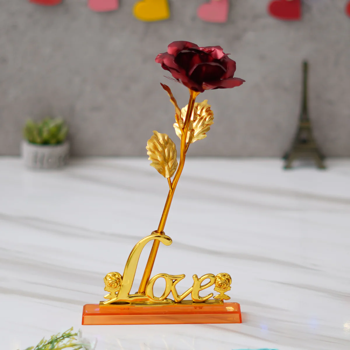 Crafted with attention to detail, the shimmering gold-plated leaves and the vibrant red rose are a symbol of everlasting love. The rose comes with a charming Love Stand, making it a perfect decorative piece for bedrooms, living rooms, offices, or special corners of your home.