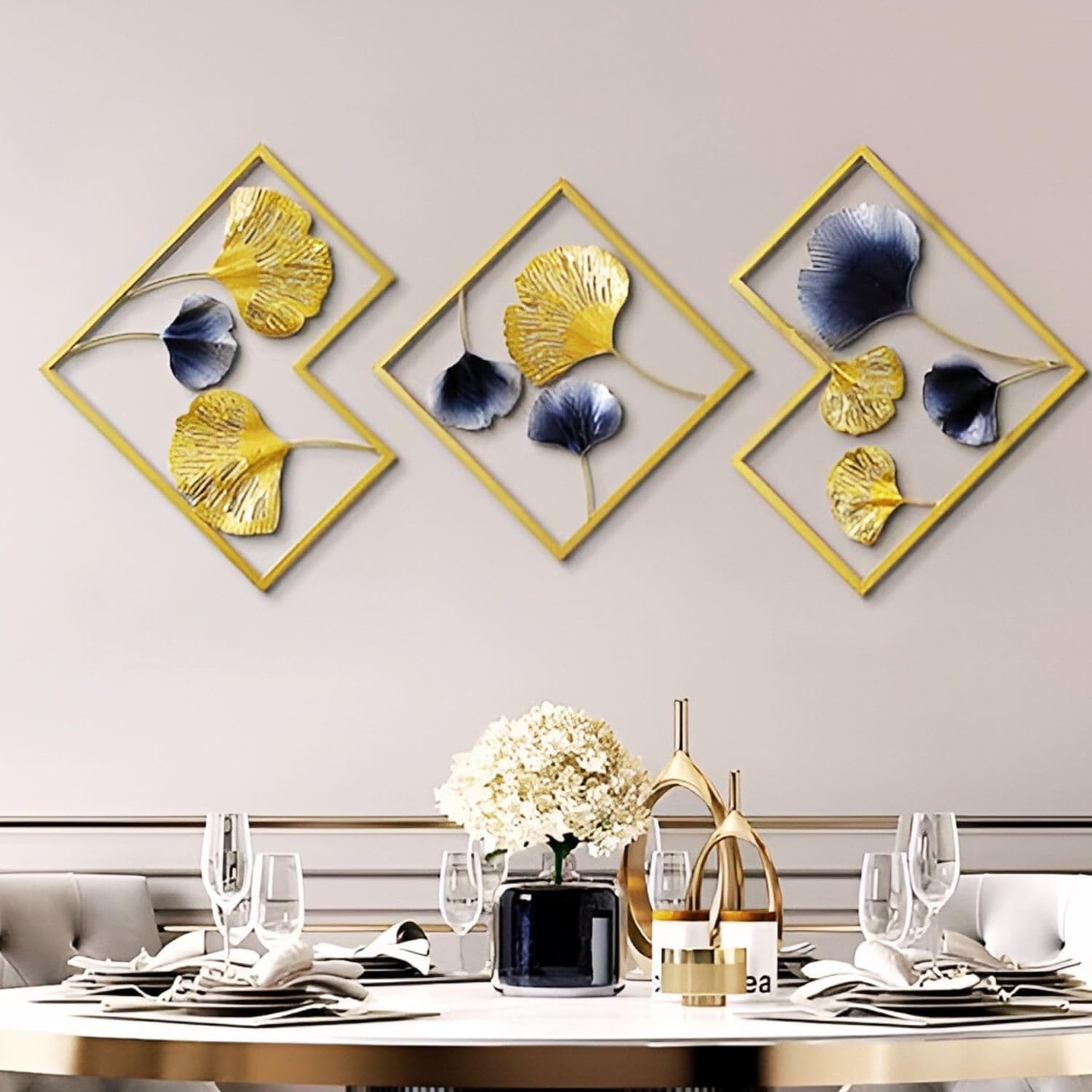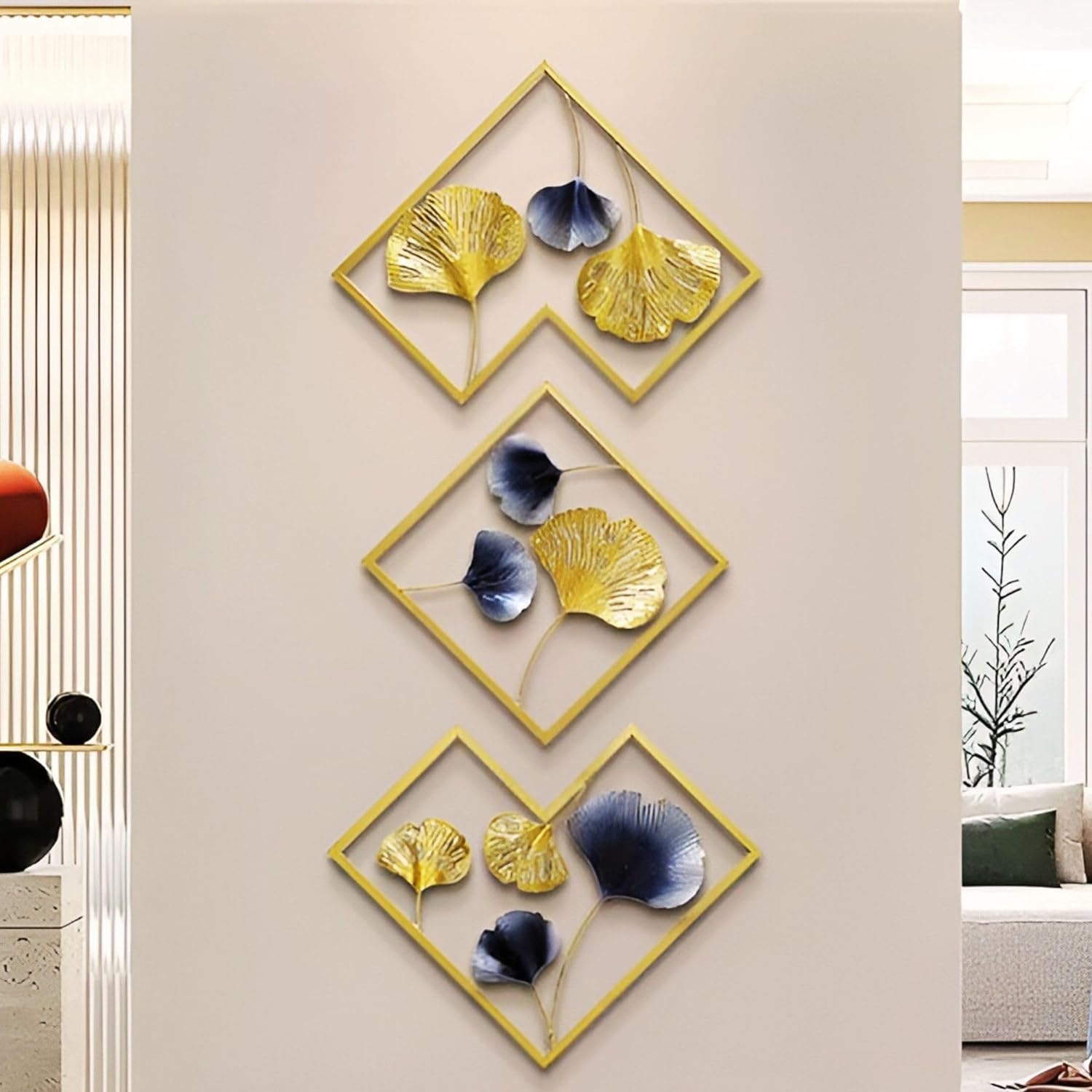 The central panel showcases a striking leaf design, symbolizing growth and harmony, while the side panels feature delicate floral-inspired motifs that complement the centerpiece. Crafted with meticulous attention to detail using high-quality metal, this wall art is built to last and maintain its charm for years.